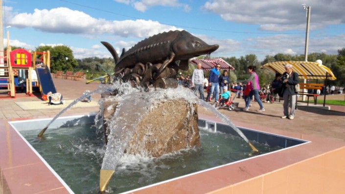 За день до открытия новой площади еще один фонтан запустили на набережной реки Урал. Здесь над рукотворной волной застыл бронзовый осетр - символ Уральска и его речных богатств. В миниатюрную статую не было вложено ни копейки бюджетных средств - это подарок ко Дню города от местных предпринимателей. Примечательно, что к открытию памятника в реку выпустили 20 молодых осетров, выращенных на экспериментальном заводе закрытого водного цикла. Выпустить молодых рыб доверили акиму города Нариману Турегалиеву, другим чиновникам и казахстанским звездам Гульнаре Сильбаевой, Сону Паскалю и Ануару Нурпеисову.