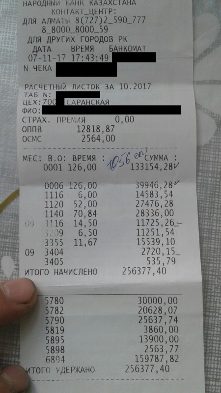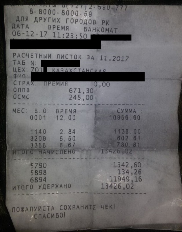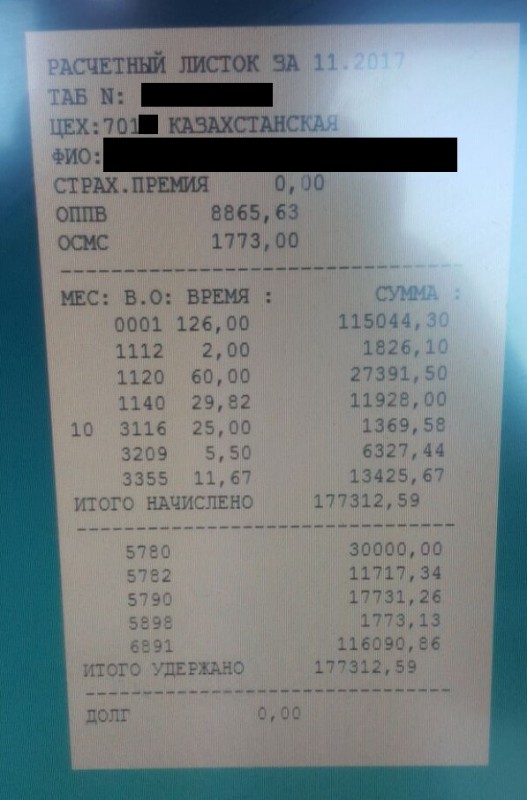 "Я - ГРОС четвертого разряда добычного участка. Работаю в лаве на добыче. До этого работал проходчиком. Когда я работал проходчиком, оклад у меня был 240 тысяч в общем. Из них 24 тысячи снимают за подоходный налог; 24 тысячи - это 10 процентов - снимают пенсионные; 1 процент профсоюз снимает, это 2400 тенге. Остается где-то 180 тысяч тенге на руки: 30 тысяч и 150 тысяч аванс. Сейчас я перешел на добычу, отучился. (…) В последний раз я получил 252 тысячи тенге, работал в шахте Саранская, был в командировке. Была 21 упряжка. Если в месяце 31 день, мы выходим 21 упряжку отрабатываем - 10 выходных. Начальство говорит, что за выходные дни будут доплачивать. Я отработал на Саранской 21 упряжку и один выходной вышел. 126 часов + 6 часов выходных. Я получил 252 тысячи в общем. Я пять лет работаю в компании", - рассказал горняк из шахты "Саранская".