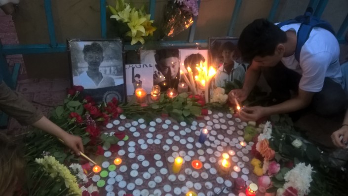 Талдыкорганцы приносили цветы и свечи к мемориалу Денису Тену у дворца спорта "Жастар".