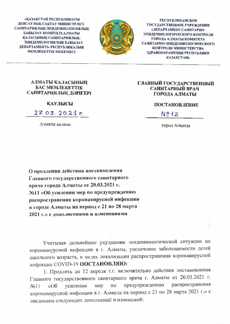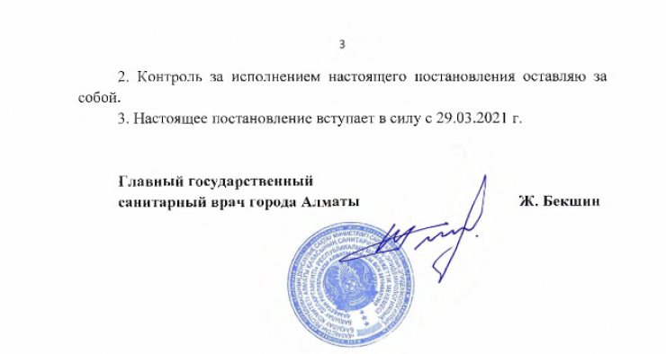 Постановление вступает в силу с 29 марта. Полный текст постановления опубликован на странице Департамента санитарно-эпидемиологического контроля города Алматы.