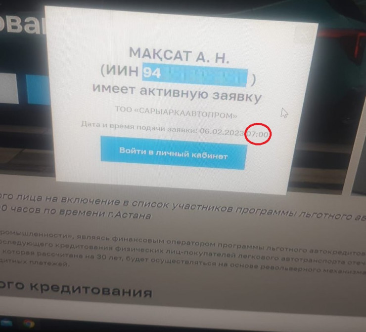 Также мы использовали снимок с платформы autonesie.kz, на котором запечатлена одна из одобренных заявок. Счастливчиком оказался некий 29-летний мужчина по имени Максат. Свое заявление он заполнил в 7:00, тогда как подача заявок официально стартовала только в 10:00.