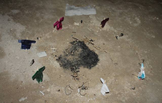 "От увиденного мне стало жутковато. На земле был очерчен круг. На нем почти на равном друг от друга расстоянии стояли подобия чучел или кукол. На деревянные скрещенные палочки накинута одежда в виде длинных платьев. Все они разного цвета. Сделаны вручную и сшиты грубым швом. Здесь же, между ними, в землю воткнуты палочки, обугленные в верхней части. По центру круга - сожженая трава и пепел. За его пределами лежал скрученный в сверток кусок светлой ткани", - сообщил очевидец.