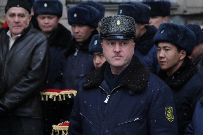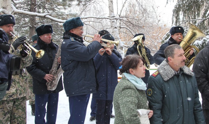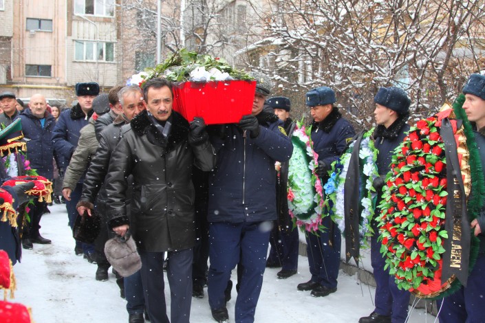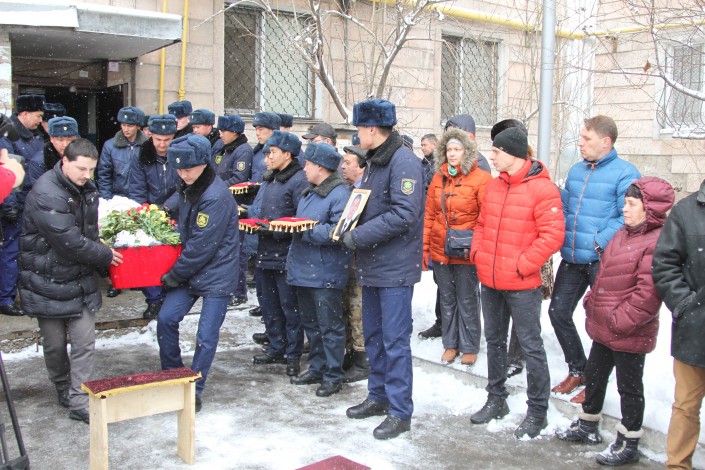 Траурная панихида началась в 11.00 в доме погибшего. Проводить пилота в последний путь пришли родственники, близкие друзья и знакомые, а также сослуживцы и боевые товарищи. Всего собралось свыше 100 человек, в числе которых военный оркестр Пограничной службы КНБ.