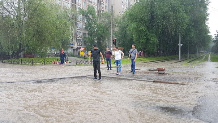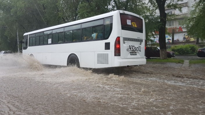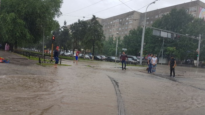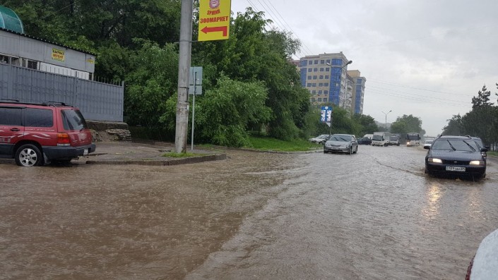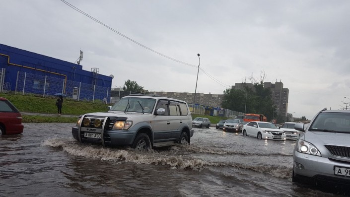 Алматинские улицы снова оказались под водой после дождя, сообщает корреспондент Тengrinews.kz. Обильные осадки, начавшиеся днем 26 мая после полудня, привели к тому, что некоторые участки дорог в городе затопило. Так, на отдельных участках по улице Толе би уровень воды достигает 10-15 сантиметров. Такая картина наблюдается от улицы Яссауи до Утеген батыра.