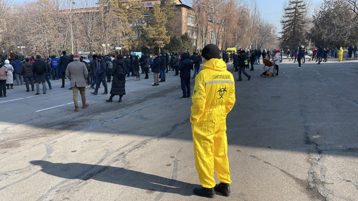 По периметру стоят несколько сотрудников Департамента санитарно-эпидемиологического контроля.