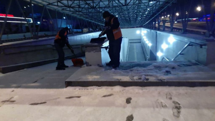 Работы по расчистке тротуаров, пешеходных зон, остановок общественного транспорта, парковочных карманов, надземных переходов, парков, скверов продолжаются.