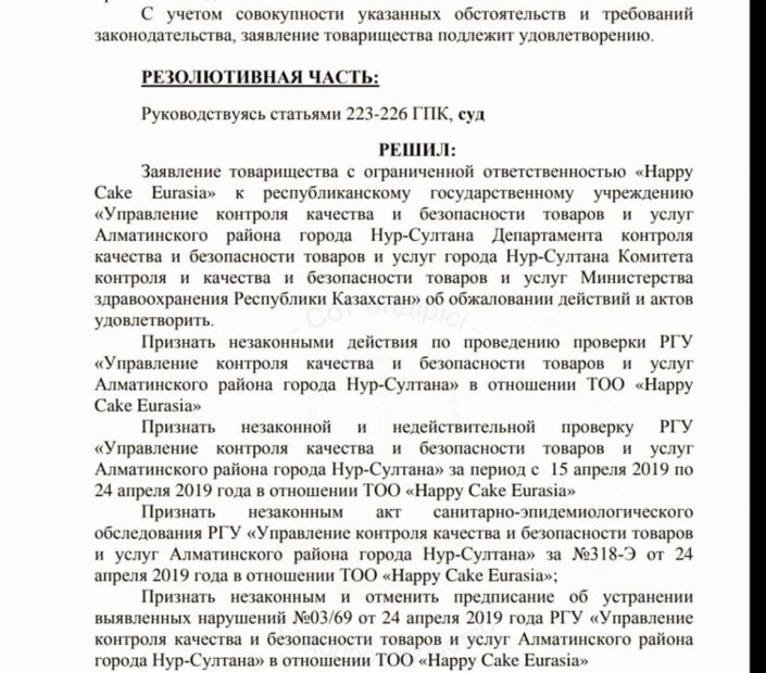 "Признать незаконными действия по проведению проверки РГУ "Управление контроля качества и безопасности товаров и услуг Алматинского района города Нур-Султана" в отношении ТОО Happy Cake Eurasia", - говорится в документе.