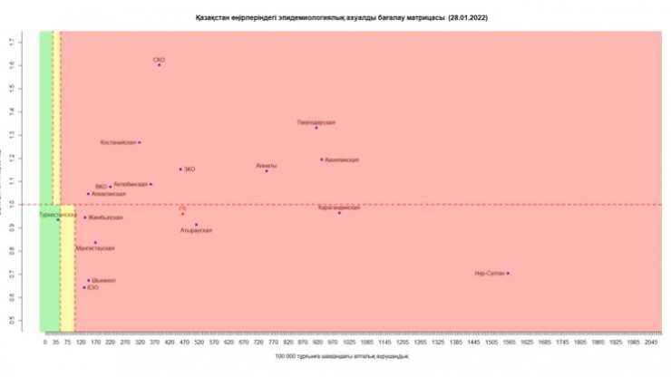 • "красной" зоне находятся Нур-Султан, Алматы, Шымкент, Атырауская, Алматинская, Акмолинская, Актюбинская, Восточно-Казахстанская, Западно-Казахстанская, Жамбылская, Мангистауская, Карагандинская, Кызылординская, Костанайская, Павлодарская, Северо-Казахстанская области;