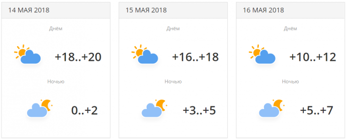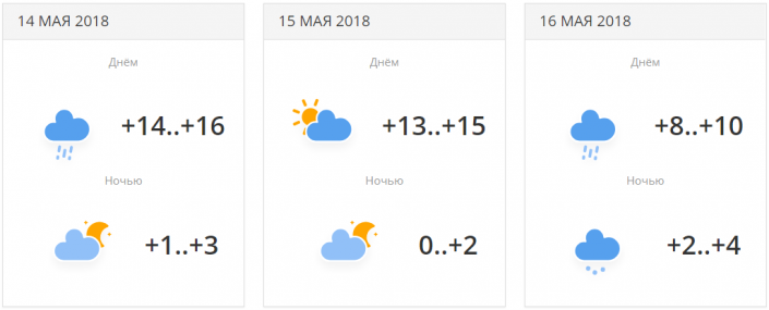 Днем резко похолодает: от +18...+20 градусов 14 числа до +10...+12 градусов 16 мая. Но поднимутся ночные температуры: с 0...+2 до +5...+7 градусов.