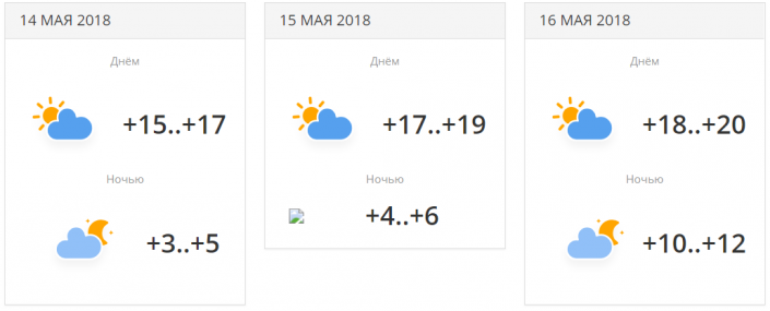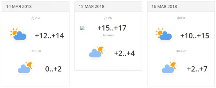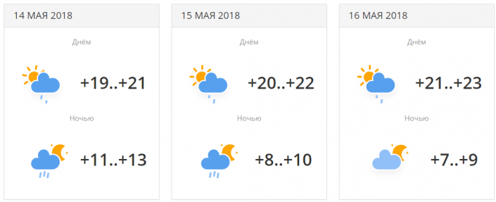 В городе прогнозируется три дня осадков с переменной облачностью. Температуры будут находиться в районе +19...+23 градусов днем. 16 мая ночью ожидается понижение температуры до +7...+9 градусов.