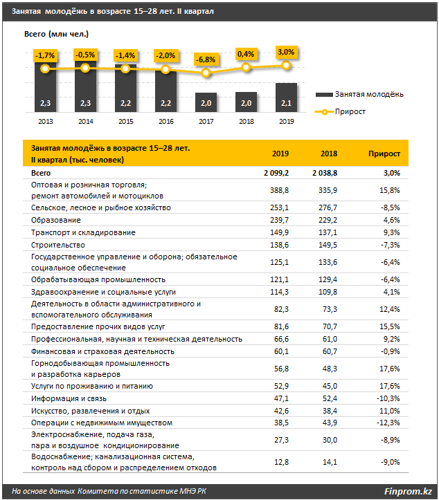 На конец второго квартала текущего года количество занятой молодежи в возрасте от 15 до 28 лет составило 2,1 миллиона человек. Что на три процента больше по сравнению с аналогичным периодом прошлого года (2 миллиона человек). Больше всего безработных, по данным аналитиков, в Алматы, далее идут Алматинская и Карагандинская области, передает Tengrinews.kz со ссылкой на Finprom.kz.