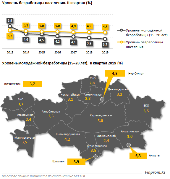 Сейчас в стране уровень безработицы составляет 4,8 процента (годом ранее - 4,9 процента). В то же время уровень молодежной безработицы снизился с 3,9 процента до 3,7 процента за год. Самый низкий уровень безработицы молодежи в возрасте от 15 до 28 лет наблюдается в Атырауской (2,4 процента), Жамбылской (2,4 процента) и Актюбинской (2,5 процента) областях. Самый высокий уровень - в городе Алматы (6,3 процента), в Карагандинской области (5 процентов) и в городе Нур-Султане (4,5 процента).