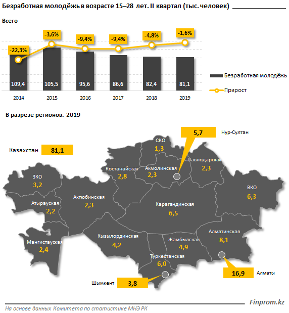 Больше всего безработных наблюдается в густонаселенном Алматы: 16,9 тысячи молодых человек - на 9,3 процента больше, чем в аналогичном периоде 2018 года (15,5 тысячи человек). Также в тройку антилидеров вошли Алматинская и Карагандинская области, где безработных молодых людей 8,1 тысячи и 6,5 тысячи, соответственно.
