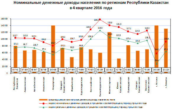 "Среднедушевые номинальные денежные доходы населения в четвертом квартале 2016 года составили 80 741 тенге и увеличились по сравнению с аналогичным периодом 2015 года на 10,7 процента. При росте цен на потребительские товары и услуги за этот период на 9,5 процента, в реальном выражении денежные доходы населения увеличились на 1,1 процента", - говорится в сообщении.