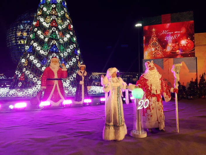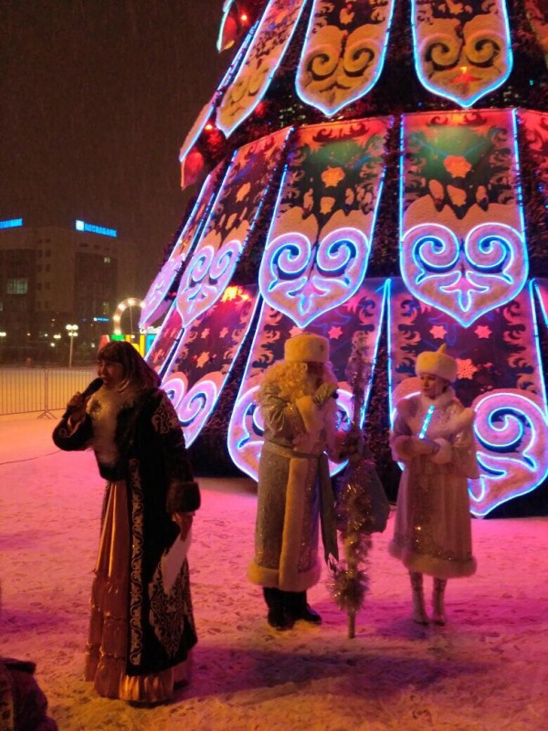 Главную елку страны торжественно зажгли 18 декабря на территории выставочного комплекса EXPO-2017. Новогодняя красавица установлена у подножия павильона "Нур Алем". Гостей вечера развлекали Дед Мороз и Снегурочка.