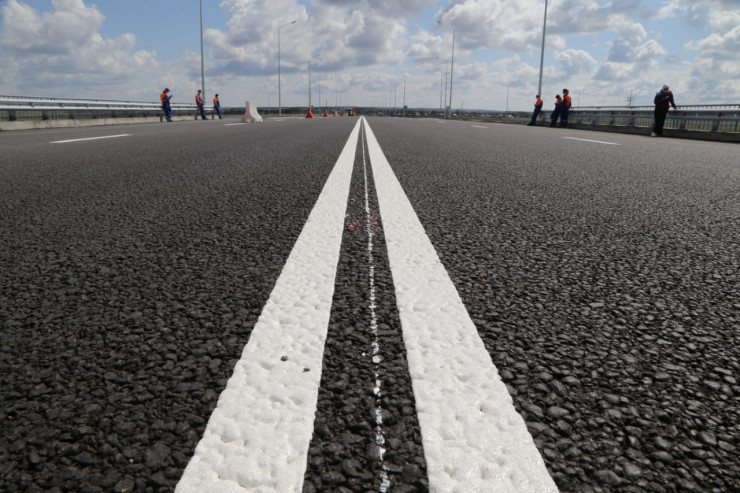 Дорога четырехполосная, асфальтобетонное покрытие из ЩМА. Срок службы дорожной "одежды" до первого ремонта - 15 лет. Для того чтобы обеспечить безопасность движения, между дорожными полосами установили криволинейный брус. Расчетная скорость - 120 километров в час.