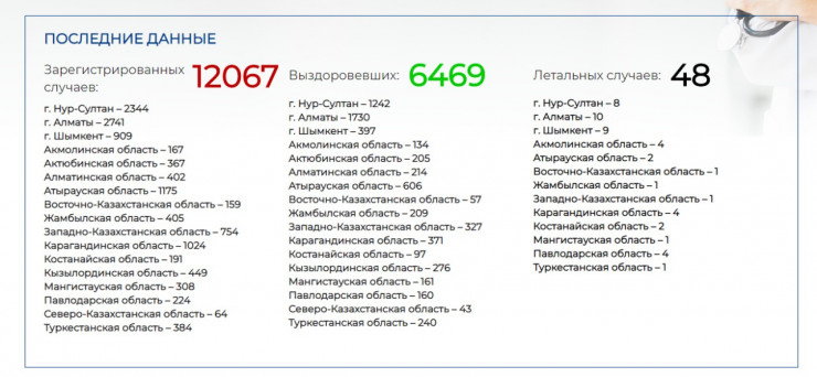 Отметим, что на сайте Coronavirus2020.kz указано другое число зарегистированных случаев. Статистика на сайте обновляется с определенной периодичностью.