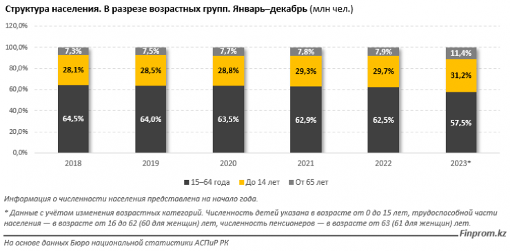 "До 2022 года в бюллетенях Бюро национальной статистики АСПиР указывались возрастные линейки по международным стандартам: дети - до 14 лет, трудоспособное население - от 15 до 64 лет, пожилые - старше 65 лет. В экспресс-информации на 1 января 2023 года численность населения по возрастам указана уже с учетом возраста выхода на пенсию именно в Казахстане: 63 года - для мужчин, 61 год - для женщин. Детское население посчитано в возрасте до 15 лет включительно", - уточнили аналитики.