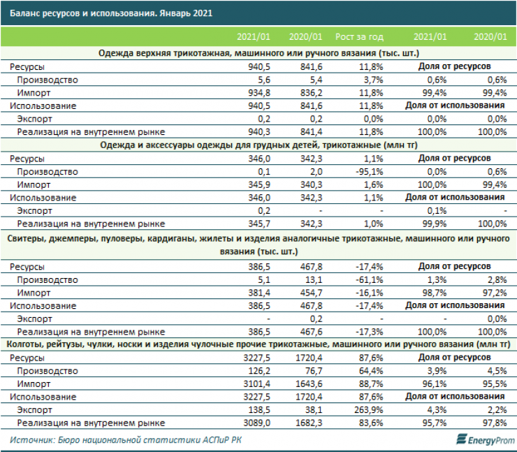 "Казахстанцы не могут рассчитывать на местную одежду. К примеру, в январе текущего года, несмотря на рост производства верхней трикотажной одежды, местные компании смогли обеспечить спрос всего на незначительные 0,6 процента. Доля импорта, соответственно, составила 99,4 процента. В страну завезли 934,8 тысячи изделий - на 11,8 процента больше. Немногим лучше обстоят дела в сегменте свитеров и джемперов (1,3 процента обеспеченности спроса) и носочно-чулочных изделий (3,9 процента), чем годом ранее".