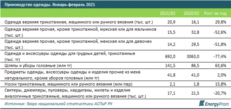 За январь-февраль 2021 года компании страны произвели одежды на семь миллиардов тенге. Это на 24,1 процента больше, чем годом ранее. В региональном разрезе наибольший объем выпуска пришелся на Алматинскую область. В тройку лидеров также вошли Алматы и Карагандинская область.