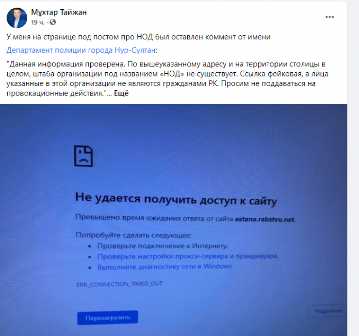 "Данная информация проверена. По вышеуказанному адресу и на территории столицы в целом штаба организации под названием НОД не существует. Ссылка фейковая, а лица, указанные в этой организации, не являются гражданами Казахстана. Просим не поддаваться на провокационные действия", - сообщили в Департаменте полиции Нур-Султана.