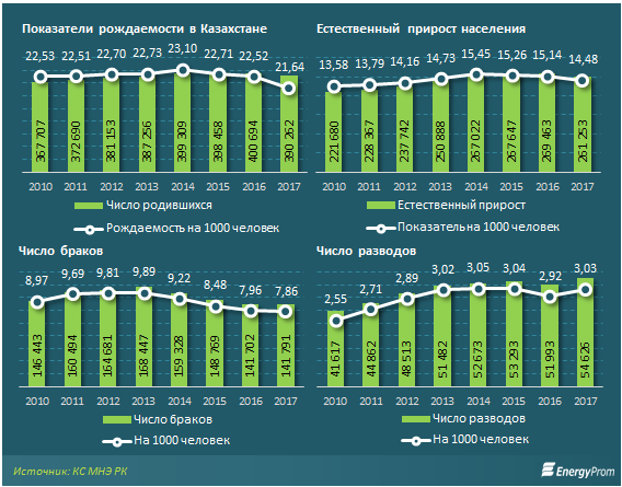 Показатели рождаемости сокращаются и по итогам 2017-го составили всего 21,6 родившихся на 1 000 человек. Также три года подряд сокращается и естественный прирост, составив к началу 2017 года всего 14,5 человек на тысячу жителей РК.