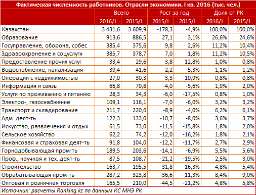 "Значительный рост также показал сектор "Предоставление прочих видов услуг" - 12,8 процента. Однако даже после столь выдающегося расширения штатов он занимает всего один процент на рынке труда РК и не влияет на общую ситуацию. Во всех остальных отраслях экономики прошли сокращения", - рассказали аналитики.
