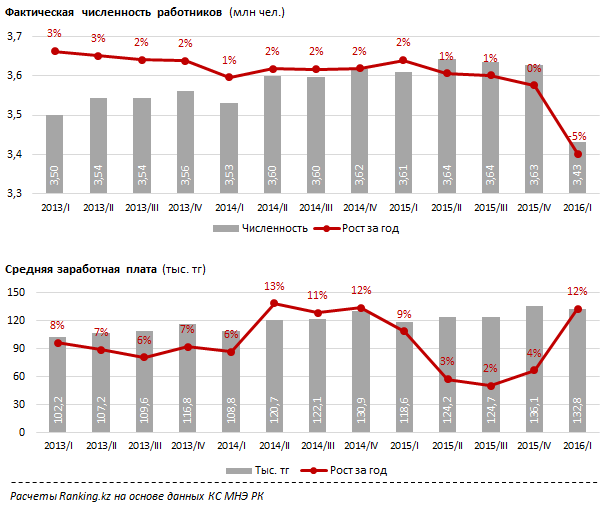 По данным специалистов, в первом квартале 2016 года трудилось 3,4 миллиона наемных работников в месяц. Это на 5 процентов меньше, чем годом ранее. При этом аналитики отмечают, что темпы роста рынка труда последовательно сокращались на протяжении всего 2015 года.