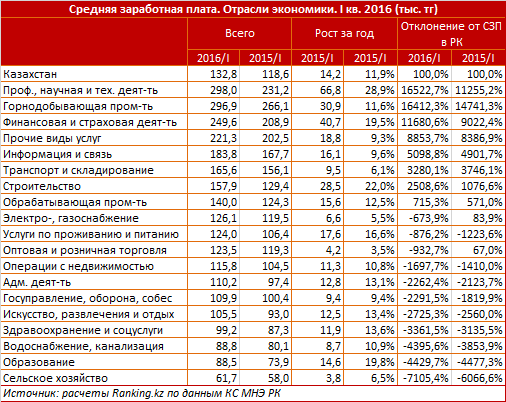 Тем временем, лидируют, как по размеру среднего заработка, так и по росту этого показателя за год, ученые и инженеры. В первом квартале их среднемесячная зарплата составила 298 тысяч тенге, увеличившись за год на 29 процентов. Ненамного отстают нефтяники и металлурги - 296,8 тысячи тенге (прирост на 12 процентов). Финансисты получают в среднем около 250 тысяч тенге в месяц (прирост в 20 процентов).