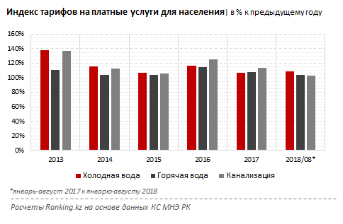 Так, по итогам прошедшего года холодная вода показывала удорожание год-к-году на 6,5 процента, горячая - на 7,4 процента, канализация - сразу на 13,2 процента.