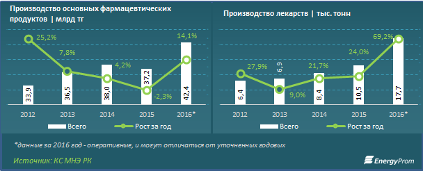 По данным аналитиков, за первый квартал 2017 года производство основных продуктов фармакологической промышленности достигло в стоимостном выражении 19 миллиардов тенге - это сразу в 2,2 раза больше, чем в аналогичном периоде 2016 года.