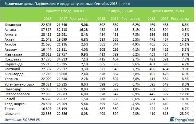 Туалетная вода выросла в цене на 5 процентов за год, до 22,6 тысячи тенге за 100 миллилитров.