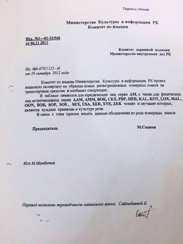 "Комитет по языкам Министерства культуры и информации РК провел языковую экспертизу на образцы новых регистрационных номерных знаков на транспортные средства и сообщает следующее: в таблице символов для юридических лиц серия АМ, а также для физических лиц встречающиеся серии ААМ, АММ, ВОК, СЕХ, FBР, НЕR, КАL, КОТ, LОХ, МАL, ООN, SOR, SOP, SOS, SEX, USA, XER, XYE, ZEK чтение и звучание которых являются чуждыми правилам и культуре речи. В связи с этим просим изъять данные обозначения из ряда номерных знаков", - говорится в письме. Документ датирован 2012 годом, однако ранее в Сети не публиковался.