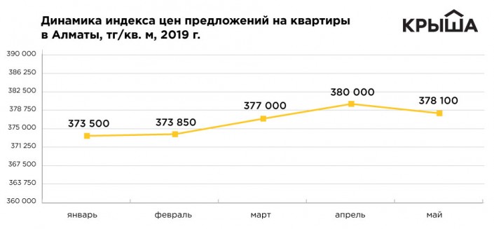 Небольшая отрицательная динамика отмечается и в Алматы. Индекс в мае составил 378 100 тенге за квадратный метр, что на 0,5 процента меньше, чем в апреле. В целом относительно начала года наблюдается прирост, линия тренда восходящая.