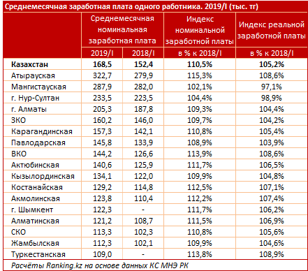 На втором месте Мангистауская область: 287,9 тысячи тенге, однако индекс реальной заработной платы составил лишь 97,1 процента (то есть покупательская способность упала на 2,9 процента). Замыкает тройку лидеров Нур-Султан: 233,5 тысячи тенге. Индекс реальной заработной платы к первому кварталу 2018 года здесь составил 98,9 процента (также наблюдается падение покупательской способности в годовой динамике).