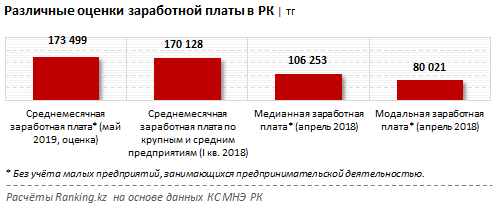 Среднемесячная заработная плата (СЗП) за май 2019 года без учета малых предприятий, занимающихся предпринимательской деятельностью, по оценке КС МНЭ РК, составила 173,5 тысячи тенге. Напомним, за первый квартал 2018 года среднемесячная заработная плата по крупным и средним предприятиям составляла 170,1 тысячи тенге. Для сравнения, СЗП по всем компаниям, включая малые предприятия, была всего 152,4 тысячи тенге.