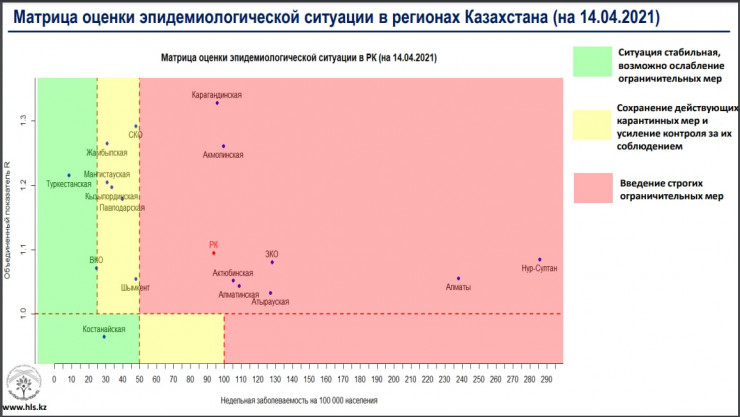 Согласно матрице оценки эпидемиологической ситуации в регионах Казахстана на 14 апреля, в "красной" зоне: Нур-Султан, Алматы, Атырауская, Актюбинская, Акмолинская, Алматинская, Западно-Казахстанская и Карагандинская области.