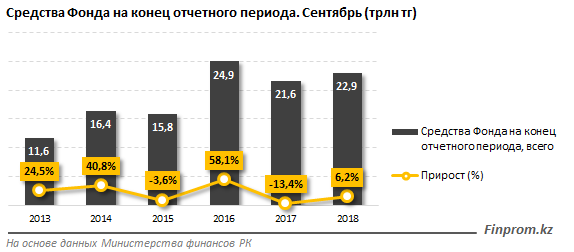 Средства Нацфонда на конец сентября 2018 года составили 22,9 триллиона тенге, что на 6,2 процента больше, чем годом ранее - 21,6 триллиона тенге. Максимальный объем средств, находящихся на счетах Нацфонда, наблюдался в соответствующем периоде в 2016 году - 24,9 триллиона тенге.