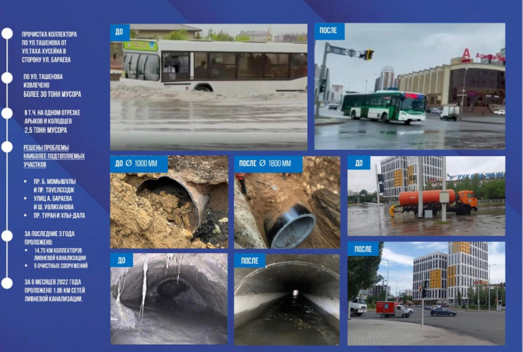 "Также ранее была решена проблема с ливневой канализацией на двух участках в районе аллеи Мынжылдык. В районе Алматы (улица Шамши Калдаякова), нового вокзала, по проспекту Улы Дала ведется строительство ливневых канализаций", - подчеркнул он.