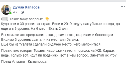 В социальной сети Facebook пользователь Думан Капасов опубликовал фотографию пассажирского вагона с тремя полками. По его словам, такие поезда курсируют по маршруту Алматы - Кызылорда.