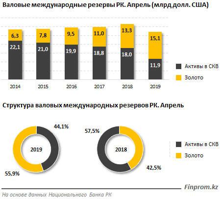 На конец апреля 2019 года в структуре международных резервов преобладает золото, доля которого составила 55,9 процента (годом ранее - лишь 42,5 процента). За год сумма увеличилась на 13,7 процента, с 13,3 миллиарда до 15,1 миллиарда долларов.