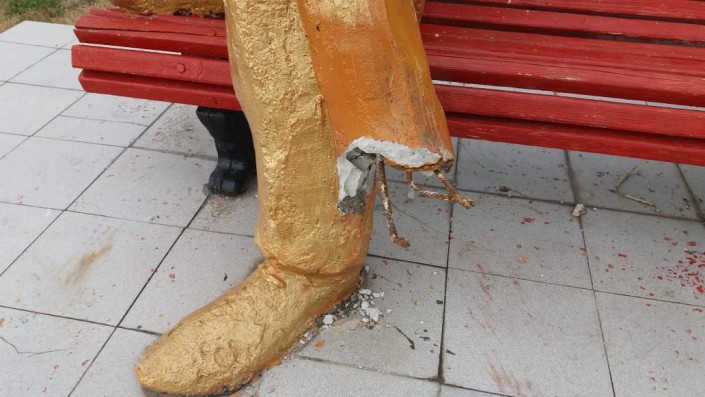 Скульптура сделала из гипса и окрашена в золотой цвет. Скорее всего, восстанавливать ее будут на месте. В коммунальной организации пояснили, что сейчас как раз думают, как лучше провести реставрационные работы. Посидеть на лавочке у Иртыша без конечности Алибасову придется еще около недели.