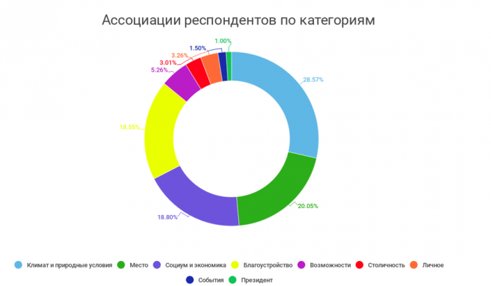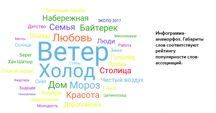 Главными ассоциациями стали слова: "ветер", "холод" и "любовь", причем "ветер" и "холод" лидировали с наибольшим отрывом от остальных ассоциаций. Среди связанных с Астаной слов горожане также отметили "понты", "дороговизну", "летающие пакеты", "чистый воздух", "плохой сервис" и "бюрократию". Слово "чиновники" также вошло в топ ассоциаций, но расположилось на 37-м месте.