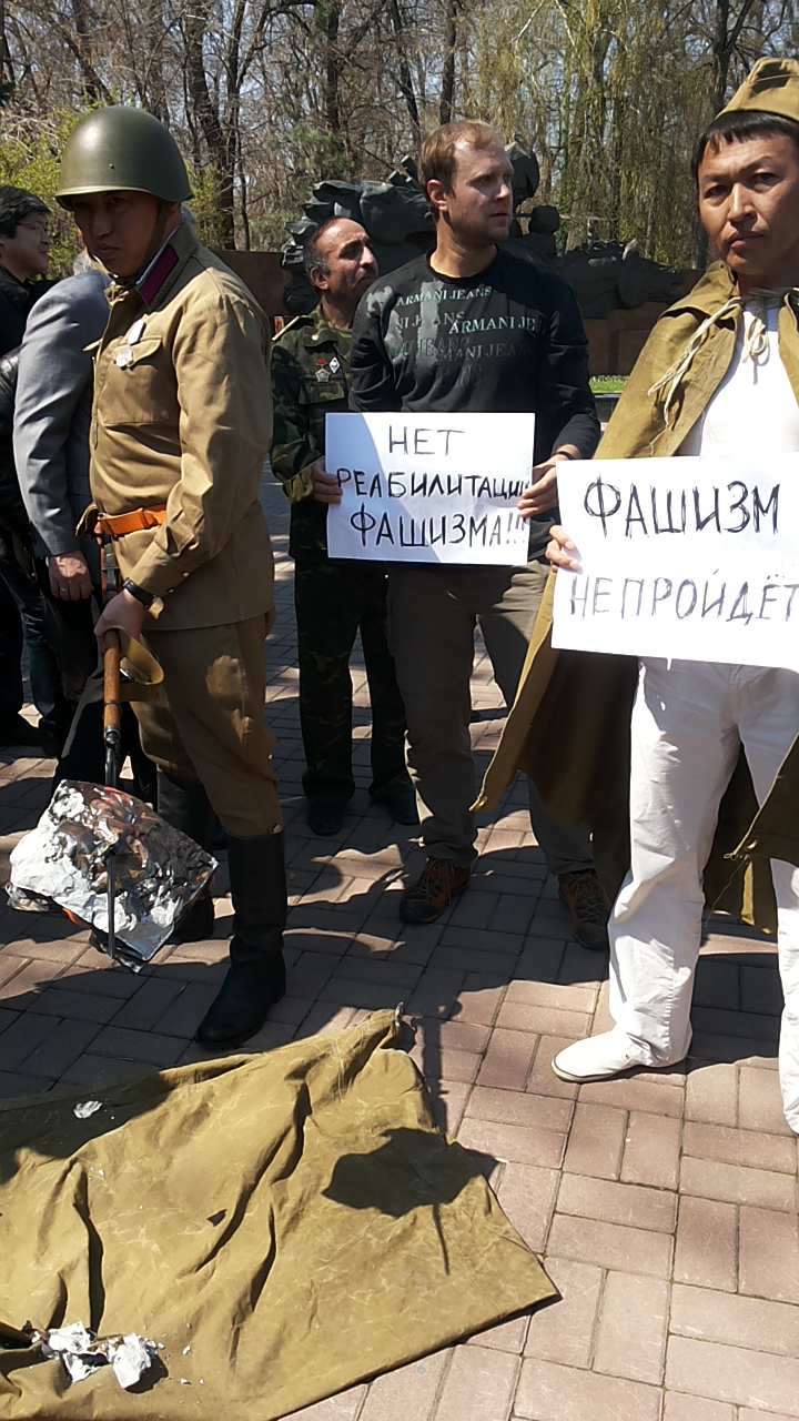 Ветераны войны в Афганистане, представители ветеранов Великой Отечественной войны, ветераны Чернобыля и  желтоксановцы публично проткнули оружием и сожгли журнал "Аныз адам. Жулдыздар отбасы" с изображением Гитлера на обложке. Такой акцией ее участники выразили свое возмущение по поводу позиции главного редактора журнала Жарылкапа Калыбая, сообщает корреспондент Tengrinews.kz.