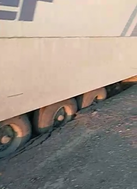 Видео фуры, застрявшей посреди дороги, прислали читатели. Автор видео отмечает, что это произошло на трассе Кокшетау - Костанай. На кадрах видно, что у грузового авто задние колеса погрязли почти полностью.
