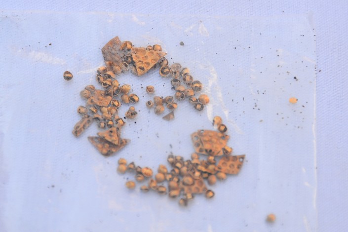Несмотря на то что захоронение было разграблено, археологам все же удалось найти ценные предметы, свидетельствующие о высокоразвитом ювелирном мастерстве наших предков. Кроме шести золотых украшений, выполненных в традиционном для сакских племен зверином стиле, обнаружены крохотные золотые бляшки размером не больше зернышка проса. К этим мелким изделиям припаяны ушки еще меньшего размера, за которые их пришивали к одежде. Это говорит о том, что искусные мастера того времени хорошо владели секретами ювелирного дела, использовали технику микропайки, не возможную без лупы.