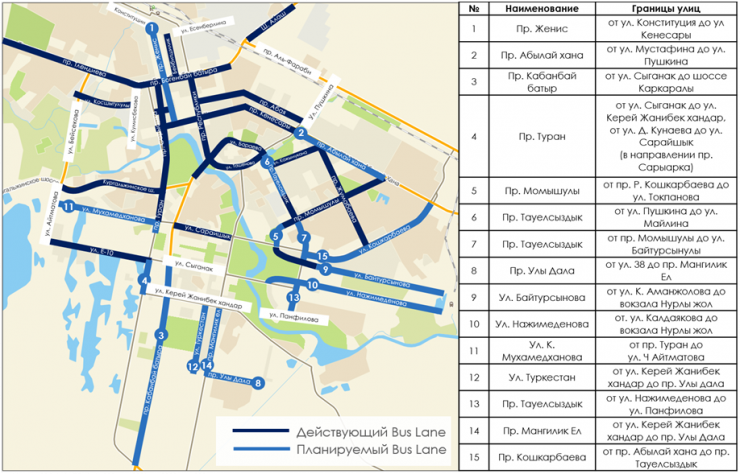При этом для автомобилистов доступными останутся четыре полосы - по две в каждом направлении. По проспекту Кабанбай батыра будет организовано пятиполосное движение. Три полосы, включая Bus Lane, в направлении города и две полосы в сторону поселка Косшы. При внедрении Bus Lane будут учитываться все интересы участников дорожного движения", - сказал Бекмырза Игенбердинов.