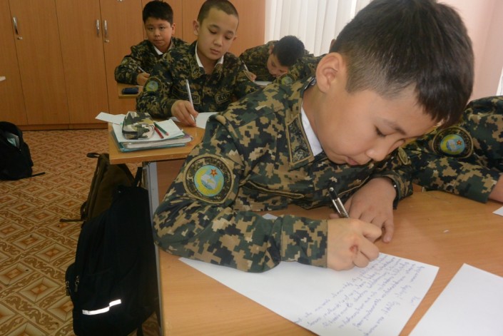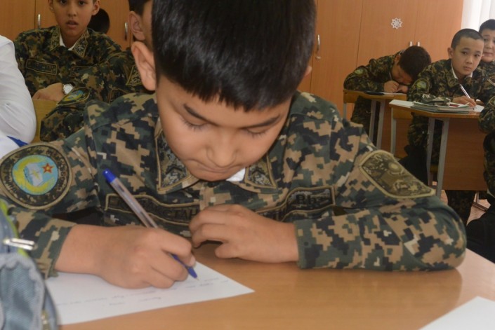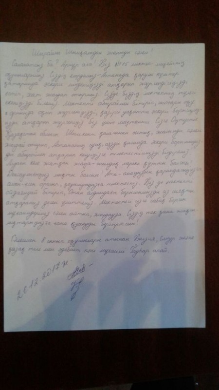 "Уважаемый военнослужащий армии Казахстана! С наступающим вас Новым годом! Желаю хорошо отслужить и вернуться домой. Я обязательно стану, как вы, защищать свою Родину", - написал командир кадетского класса Марлен Жанабаев.