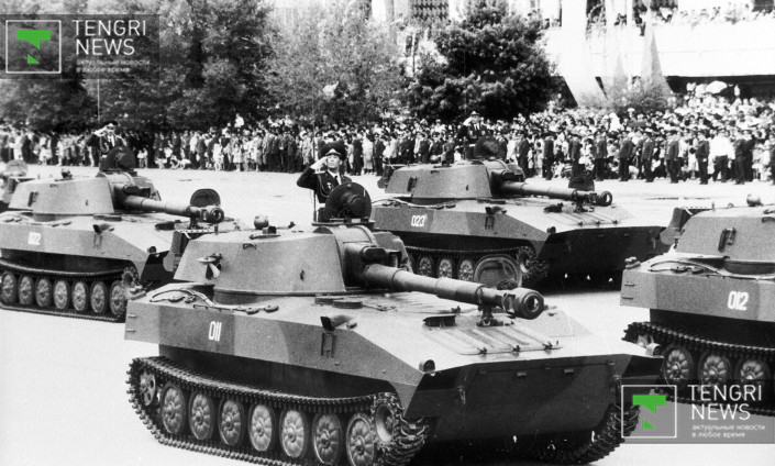Военный парад в честь 50-летия Великой Победы. Алматы, 1995 год. Фото: Центральный государственный архив кинофотодокументов и звукозаписей РК.