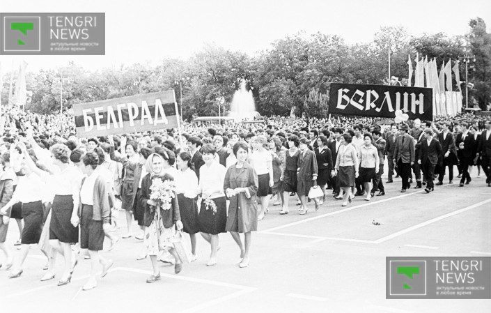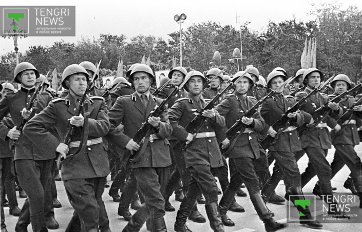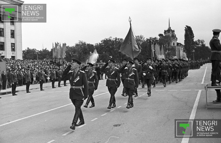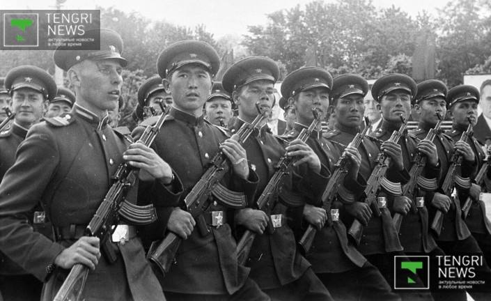 Военный парад в честь 20-летия Победы над гитлеровской Германией. Алма-Ата, 9 мая 1965 год. Фото: Центральный государственный архив кинофотодокументов и звукозаписей РК.